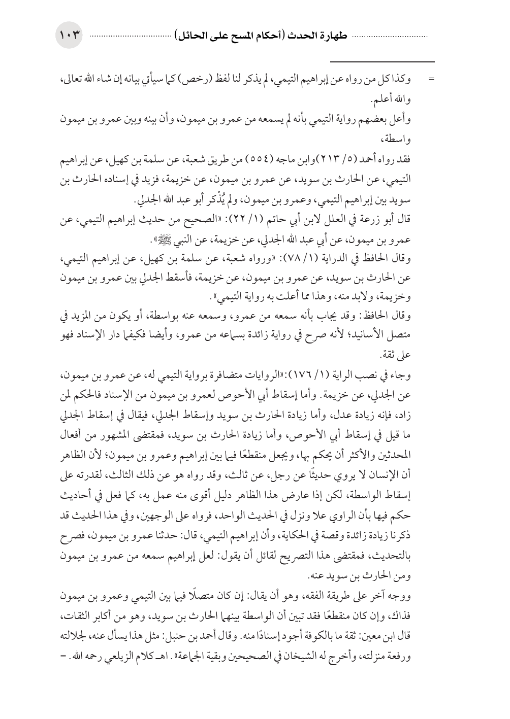 وجاء في نصب الراية (١/ ١٧٦): «الروايات متضافرة برواية التيمي له، عن عمرو بن ميمون، عن الجدلي، عن خزيمة. وأما إسقاط أبي الأحوص لعمرو بن ميمون من الإسناد فالحكم لمن زاد، فإنه زيادة عدل، وأما زيادة الحارث بن سويد وإسقاط الجدلي، فيقال في إسقاط الجدلي ما قيل في إسقاط أبي الأحوص، وأما زيادة الحارث بن سويد، فمقتضى المشهور من أفعال المحدثين والأكثر أن يحكم بها، ويجعل منقطعًا فيما بين إبراهيم وعمرو بن ميمون؛ لأن الظاهر أن الإنسان لا يروي حديثًا عن رجل، عن ثالث، وقد رواه هو عن ذلك الثالث، لقدرته على إسقاط الواسطة، لكن إذا عارض هذا الظاهر دليل أقوى منه عمل به، كما فعل في أحاديث حكم فيها بأن الراوي علا ونزل في الحديث الواحد، فرواه على الوجهين، وفي هذا الحديث قد ذكرنا زيادة زائدة وقصة في الحكاية، وأن إبراهيم التيمي، قال: حدثنا عمرو بن ميمون، فصرح بالتحديث، فمقتضى هذا التصريح لقائل أن يقول: لعل إبراهيم سمعه من عمرو بن ميمون ومن الحارث بن سويد عنه.