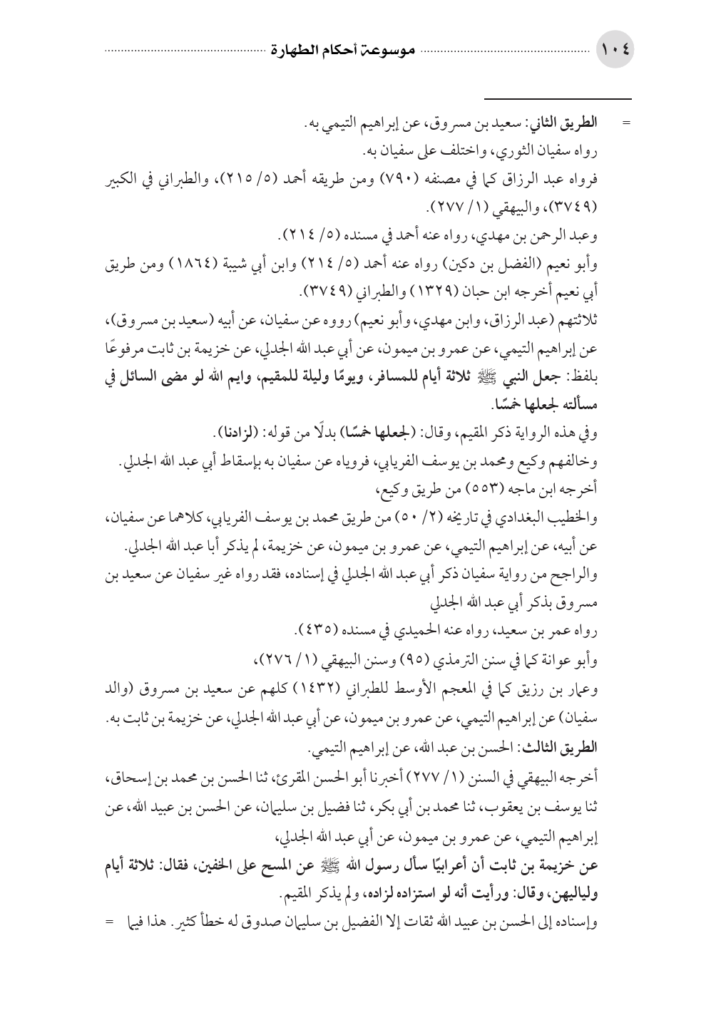 ثلاثتهم (عبد الرزاق، وابن مهدي، وأبو نعيم) رووه عن سفيان، عن أبيه (سعيد بن مسروق)، عن إبراهيم التيمي، عن عمرو بن ميمون، عن أبي عبد الله الجدلي، عن خزيمة بن ثابت مرفوعًا بلفظ: جعل النبي صلى الله عليه وسلم ثلاثة أيام للمسافر، ويومًا وليلة للمقيم، وايم الله لو مضى السائل في مسألته لجعلها خمسًا.
