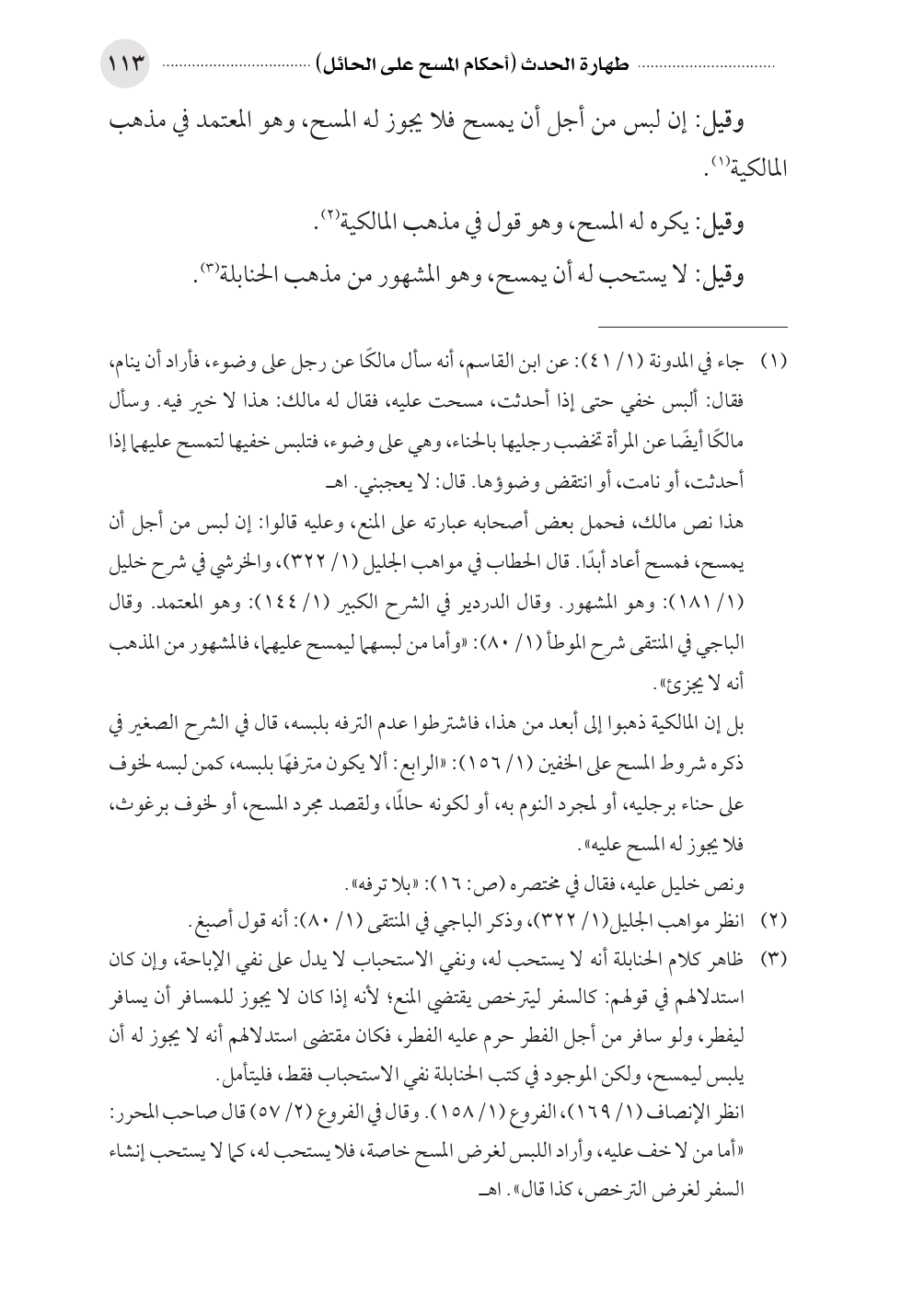 (¬١) جاء في المدونة (١/ ٤١): عن ابن القاسم، أنه سأل مالكًا عن رجل على وضوء، فأراد أن ينام، فقال: ألبس خفي حتى إذا أحدثت، مسحت عليه، فقال له مالك: هذا لا خير فيه. وسأل مالكًا أيضًا عن المرأة تخضب رجليها بالحناء، وهي على وضوء، فتلبس خفيها لتمسح عليهما إذا أحدثت، أو نامت، أو انتقض وضوؤها. قال: لا يعجبني. اهـ