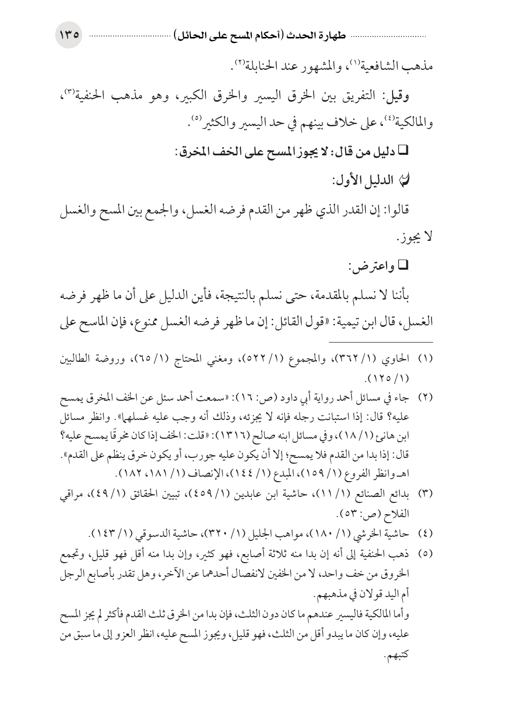 (¬٥) ذهب الحنفية إلى أنه إن بدا منه ثلاثة أصابع، فهو كثير، وإن بدا منه أقل فهو قليل، وتجمع الخروق من خف واحد، لا من الخفين لانفصال أحدهما عن الآخر، وهل تقدر بأصابع الرجل أم اليد قولان في مذهبهم.