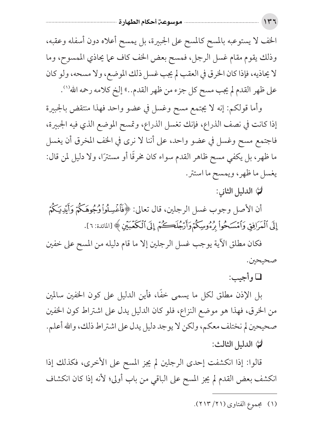 وأما قولكم: إنه لا يجتمع مسح وغسل في عضو واحد فهذا منتقض بالجبيرة إذا كانت في نصف الذراع، فإنك تغسل الذراع، وتمسح الموضع الذي فيه الجبيرة، فاجتمع مسح وغسل في عضو واحد، على أننا لا نرى في الخف المخرق أن يغسل ما ظهر، بل يكفي مسح ظاهر القدم سواء كان مخرقًا أو مستترًا، ولا دليل لمن قال: يغسل ما ظهر، ويمسح ما استتر.