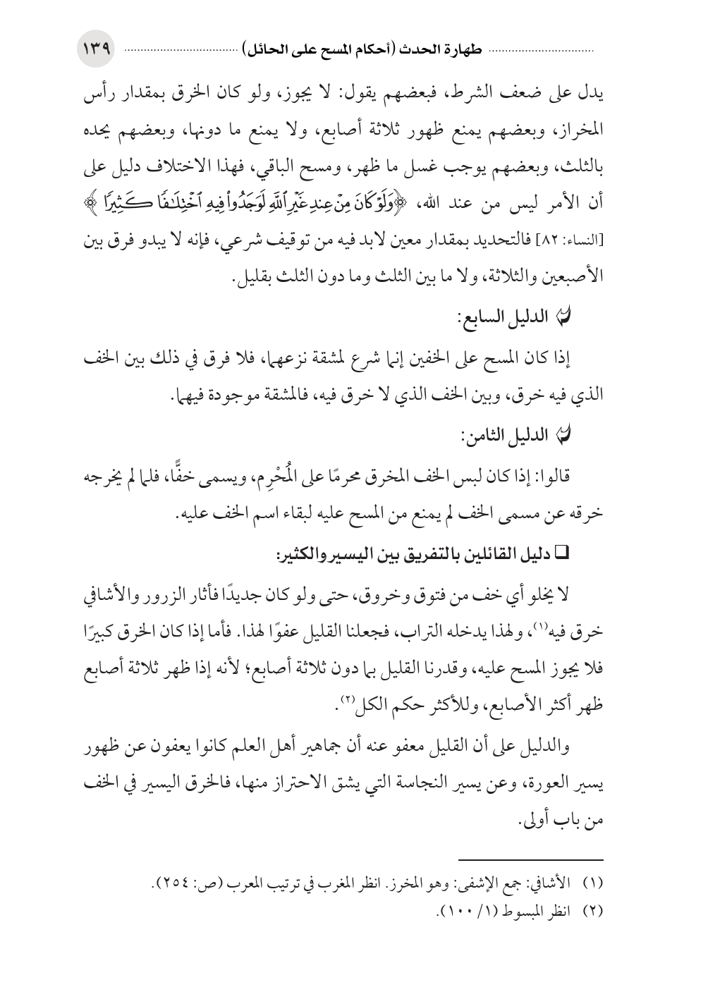 يدل على ضعف الشرط، فبعضهم يقول: لا يجوز، ولو كان الخرق بمقدار رأس المخراز، وبعضهم يمنع ظهور ثلاثة أصابع، ولا يمنع ما دونها، وبعضهم يحده بالثلث، وبعضهم يوجب غسل ما ظهر، ومسح الباقي، فهذا الاختلاف دليل على أن الأمر ليس من عند الله، (وَلَوْ كَانَ مِنْ عِندِ غَيْرِ اللَّهِ لَوَجَدُوا فِيهِ اخْتِلافاً كَثِيراً) [النساء: ٨٢] فالتحديد بمقدار معين لابد فيه من توقيف شرعي، فإنه لا يبدو فرق بين الأصبعين والثلاثة، ولا ما بين الثلث وما دون الثلث بقليل.