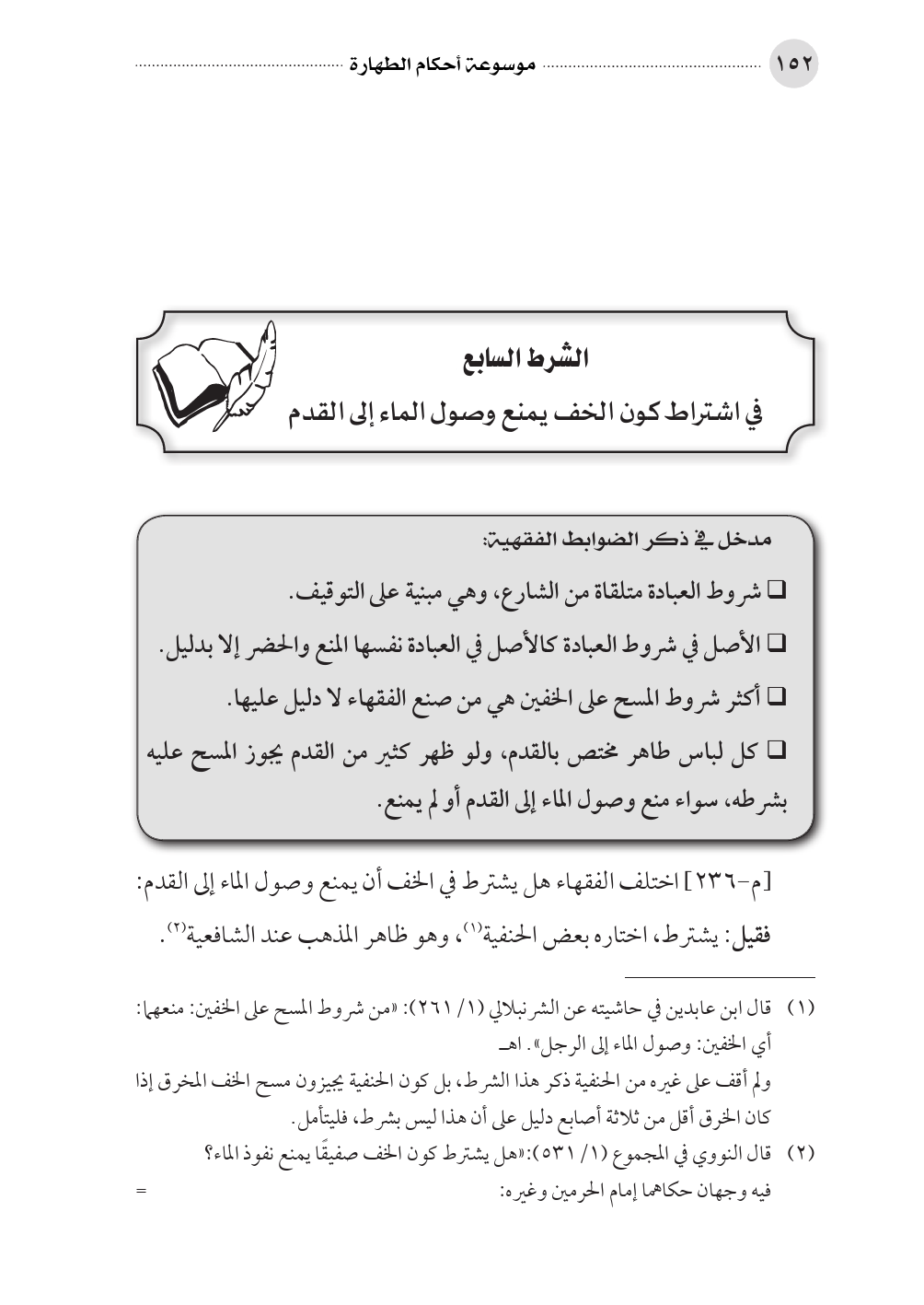 (¬١) قال ابن عابدين في حاشيته عن الشرنبلالي (١/ ٢٦١): «من شروط المسح على الخفين: منعهما: أي الخفين: وصول الماء إلى الرجل». اهـ