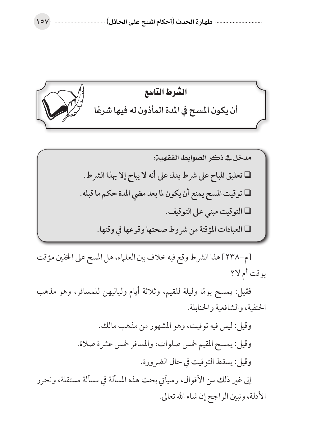 [م-٢٣٨] هذا الشرط وقع فيه خلاف بين العلماء، هل المسح على الخفين مؤقت بوقت أم لا؟