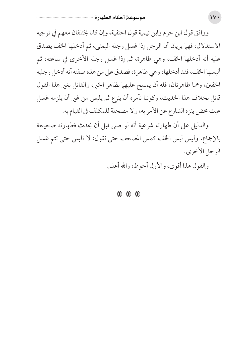 ووافق قول ابن حزم وابن تيمية قول الحنفية، وإن كانا يختلفان معهم في توجيه الاستدلال، فهما يريان أن الرجل إذا غسل رجله اليمنى، ثم أدخلها الخف يصدق عليه أنه أدخلها الخف، وهي طاهرة، ثم إذا غسل رجله الأخرى في ساعته، ثم ألبسها الخف، فقد أدخلها، وهي طاهرة، فصدق على من هذه صفته أنه أدخل رجليه الخفين، وهما طاهرتان، فله أن يمسح عليهما بظاهر الخبر، والقائل بغير هذا القول قائل بخلاف هذا الحديث، وكوننا نأمره أن ينزع ثم يلبس من غير أن يلزمه غسل عبث محض ينزه الشارع عن الأمر به، ولا مصلحة للمكلف في القيام به.