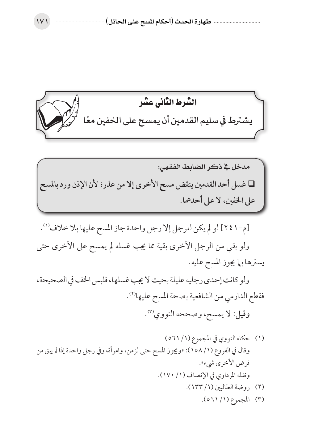 (¬١) حكاه النووي في المجموع (١/ ٥٦١). وقال في الفروع (١/ ١٥٨): «ويجوز المسح حتى لزمن، وامرأة، وفي رجل واحدة إذا لم يبق من فرض الأخرى شيء».ونقله المرداوي في الإنصاف (١/ ١٧٠).