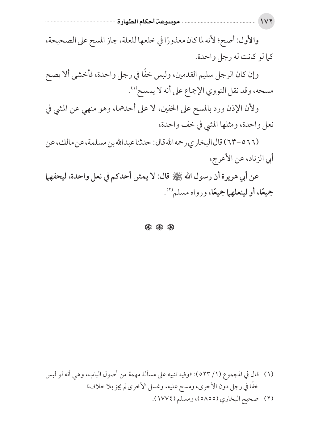 (¬١) قال في المجموع (١/ ٥٢٣): «وفيه تنبيه على مسألة مهمة من أصول الباب، وهي أنه لو لبس خفًا في رجل دون الأخرى، ومسح عليه، وغسل الأخرى لم يجز بلا خلاف».