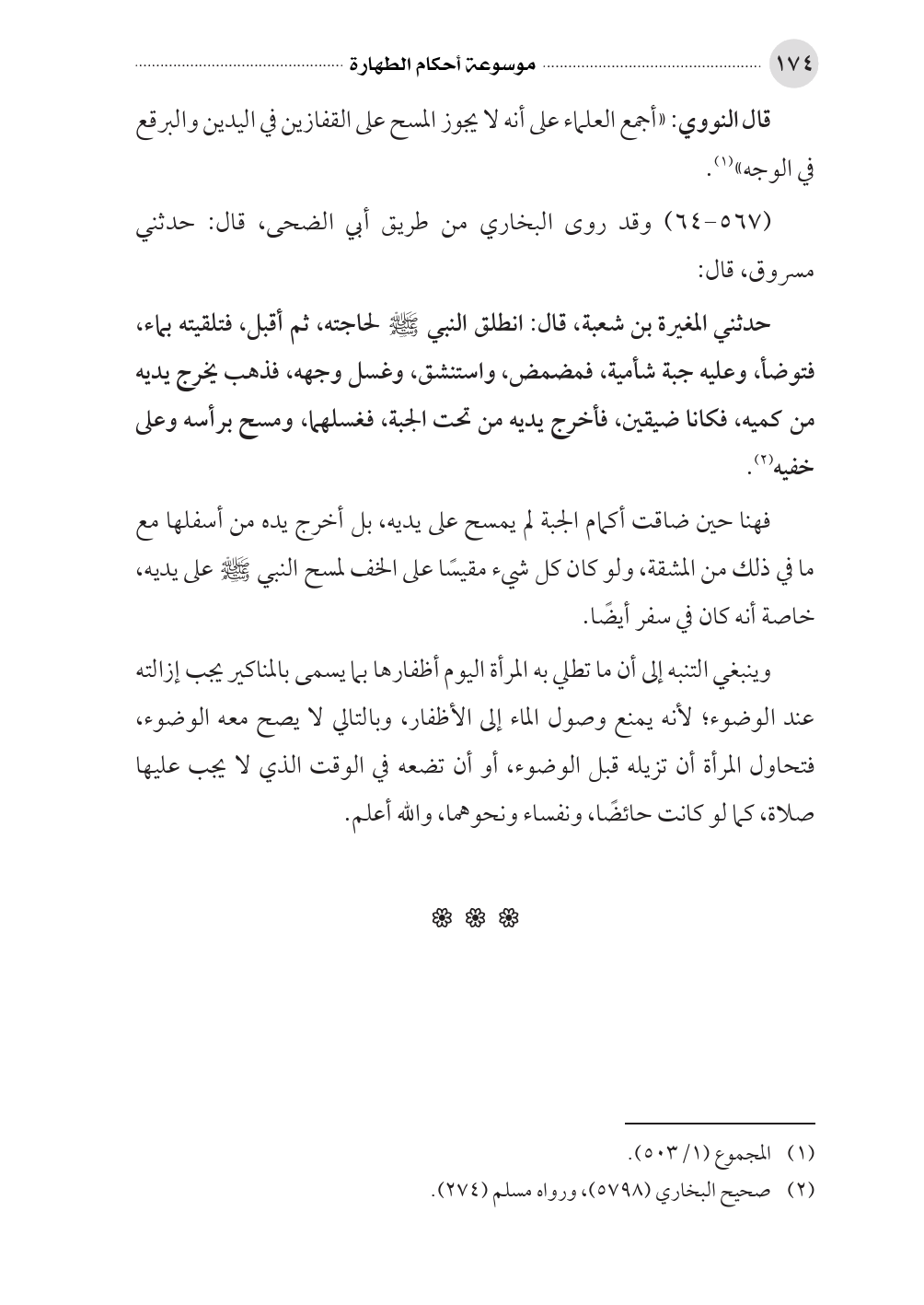 فهنا حين ضاقت أكمام الجبة لم يمسح على يديه، بل أخرج يده من أسفلها مع ما في ذلك من المشقة، ولو كان كل شيء مقيسًا على الخف لمسح النبي صلى الله عليه وسلم على يديه، خاصة أنه كان في سفر أيضًا.