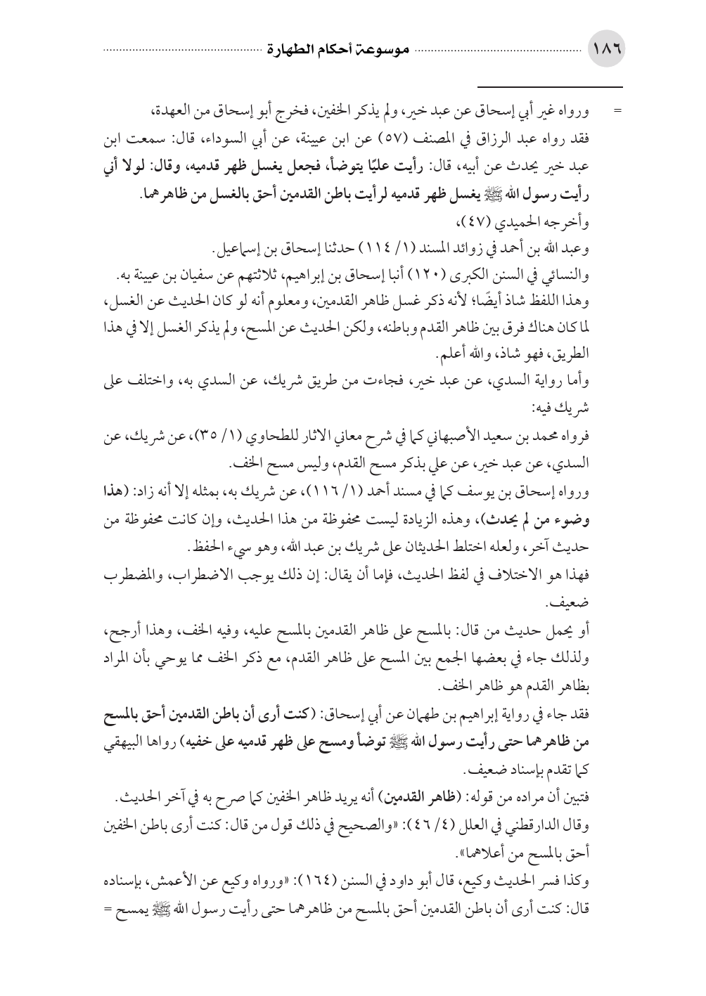= ورواه غير أبي إسحاق عن عبد خير، ولم يذكر الخفين، فخرج أبو إسحاق من العهدة،
