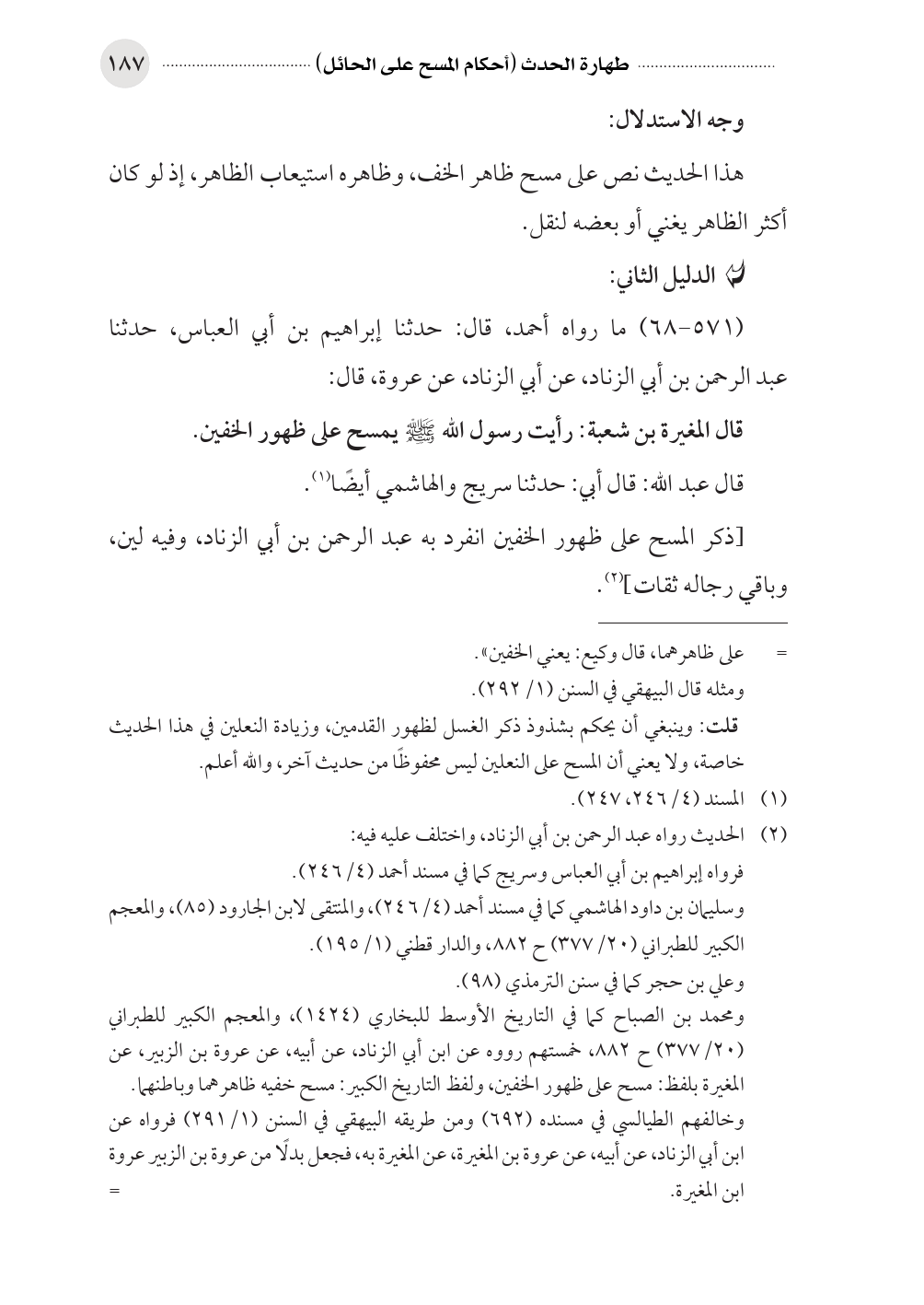 ومحمد بن الصباح كما في التاريخ الأوسط للبخاري (١٤٢٤)، والمعجم الكبير للطبراني (٢٠/ ٣٧٧) ح ٨٨٢، خمستهم رووه عن ابن أبي الزناد، عن أبيه، عن عروة بن الزبير، عن المغيرة بلفظ: مسح على ظهور الخفين، ولفظ التاريخ الكبير: مسح خفيه ظاهرهما وباطنهما.