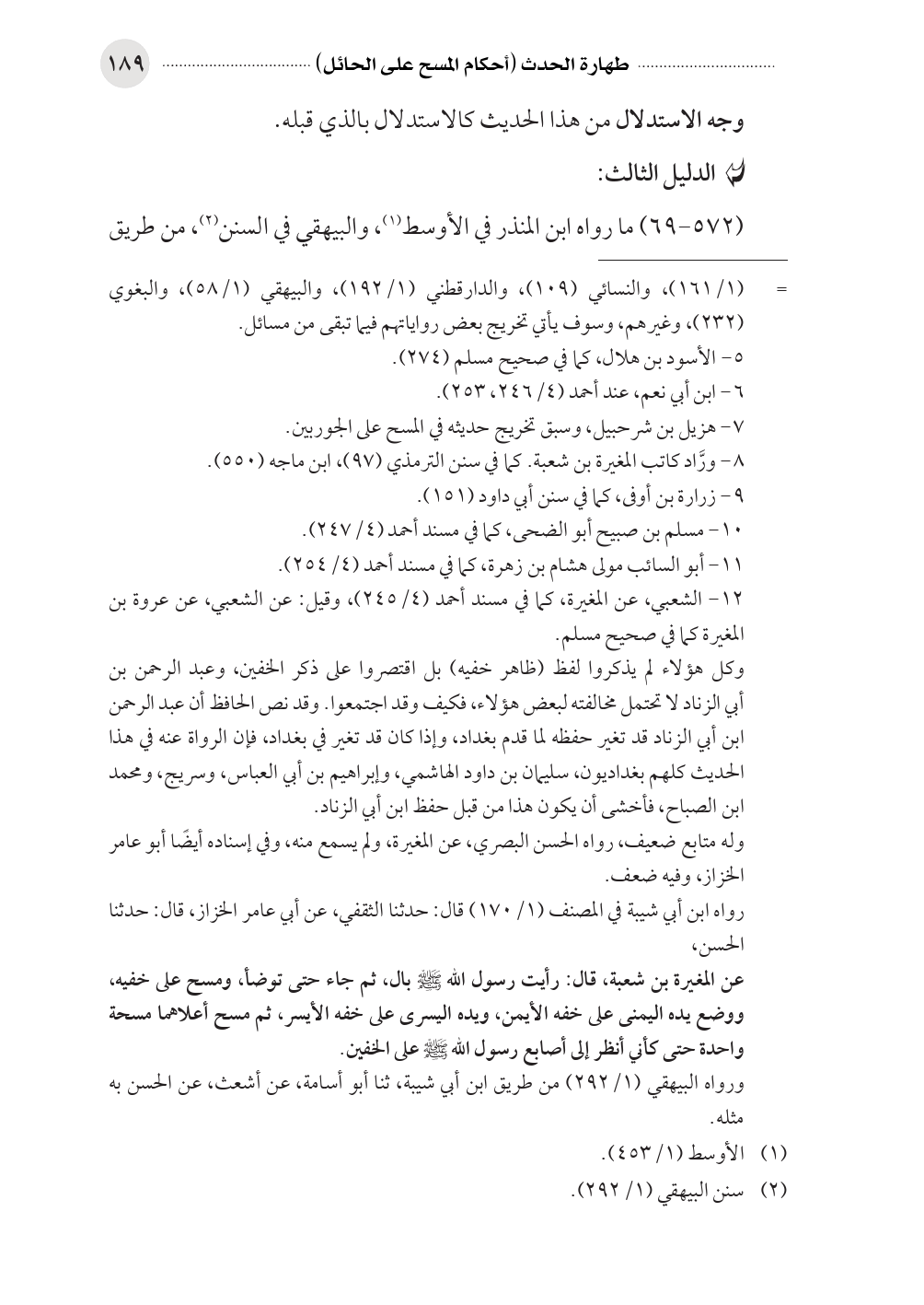 وكل هؤلاء لم يذكروا لفظ (ظاهر خفيه) بل اقتصروا على ذكر الخفين، وعبد الرحمن بن أبي الزناد لا تحتمل مخالفته لبعض هؤلاء، فكيف وقد اجتمعوا. وقد نص الحافظ أن عبد الرحمن ابن أبي الزناد قد تغير حفظه لما قدم بغداد، وإذا كان قد تغير في بغداد، فإن الرواة عنه في هذا الحديث كلهم بغداديون، سليمان بن داود الهاشمي، وإبراهيم بن أبي العباس، وسريج، ومحمد ابن الصباح، فأخشى أن يكون هذا من قبل حفظ ابن أبي الزناد.