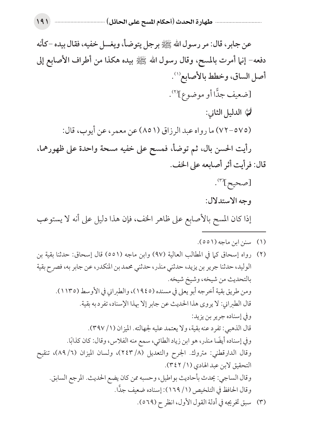 عن جابر، قال: مر رسول الله صلى الله عليه وسلم برجل يتوضأ، ويغسل خفيه، فقال بيده -كأنه دفعه- إنما أمرت بالمسح، وقال رسول الله صلى الله عليه وسلم بيده هكذا من أطراف الأصابع إلى أصل الساق، وخطط بالأصابع (¬١).