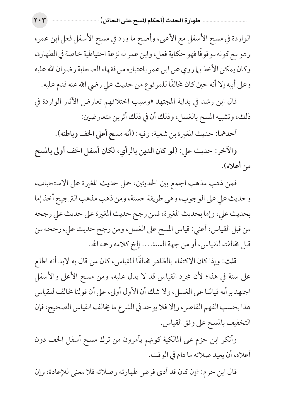 قلت: وإذا كان الاكتفاء بالظاهر مخالفًا للقياس، كان من قال به لابد أنه اطلع على سنة في هذا؛ لأن مجرد القياس قد لا يدل عليه، ومن مسح الأعلى والأسفل اجتهد برأيه قياسًا على الغسل، ولا شك أن الأول أولى، على أن قولنا مخالف للقياس هذا بحسب الفهم القاصر، وإلا فلا يوجد في الشرع ما يخالف القياس الصحيح، فإن التخفيف بالمسح على وفق القياس.