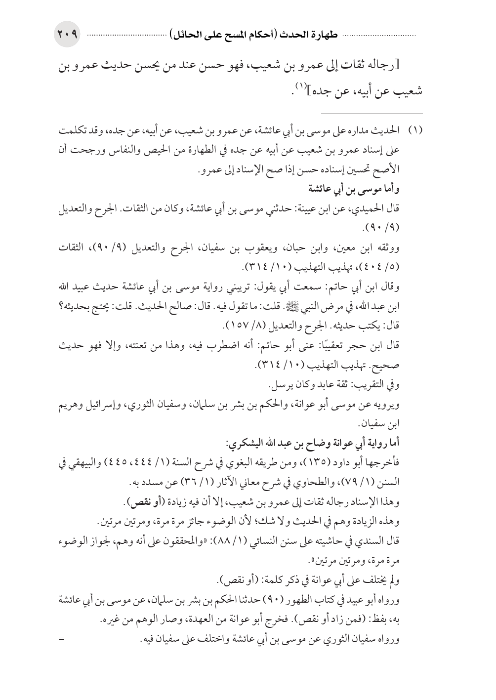 (¬١) الحديث مداره على موسى بن أبي عائشة، عن عمرو بن شعيب، عن أبيه، عن جده، وقد تكلمت على إسناد عمرو بن شعيب عن أبيه عن جده في الطهارة من الحيص والنفاس ورجحت أن الأصح تحسين إسناده حسن إذا صح الإسناد إلى عمرو.