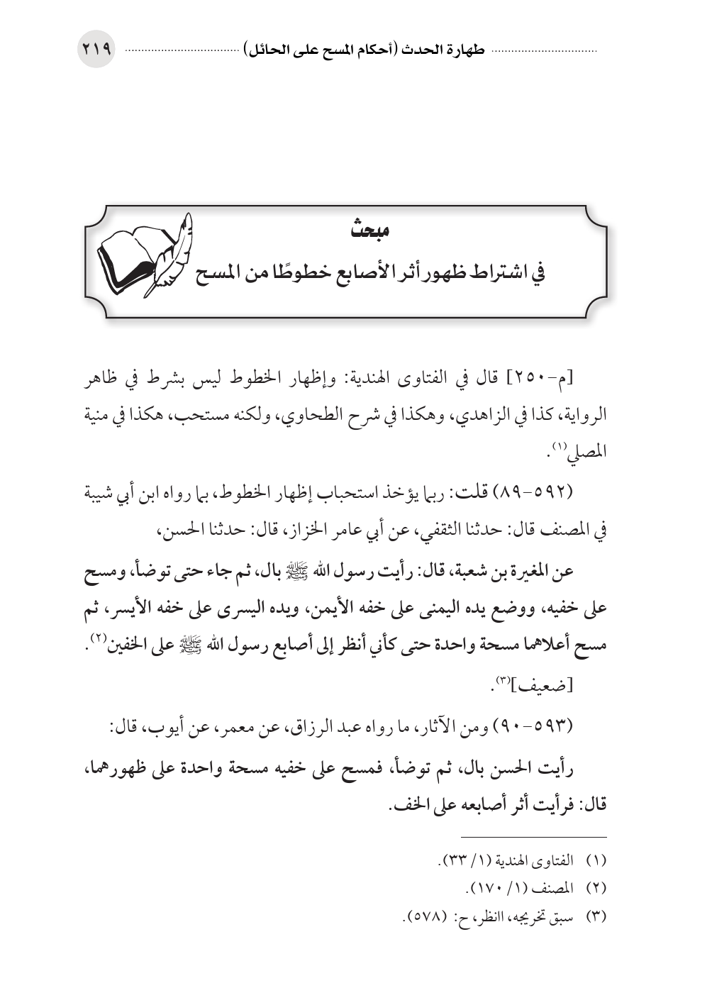 (٥٩٢ - ٨٩) قلت: ربما يؤخذ استحباب إظهار الخطوط، بما رواه ابن أبي شيبة في المصنف قال: حدثنا الثقفي، عن أبي عامر الخزاز، قال: حدثنا الحسن،