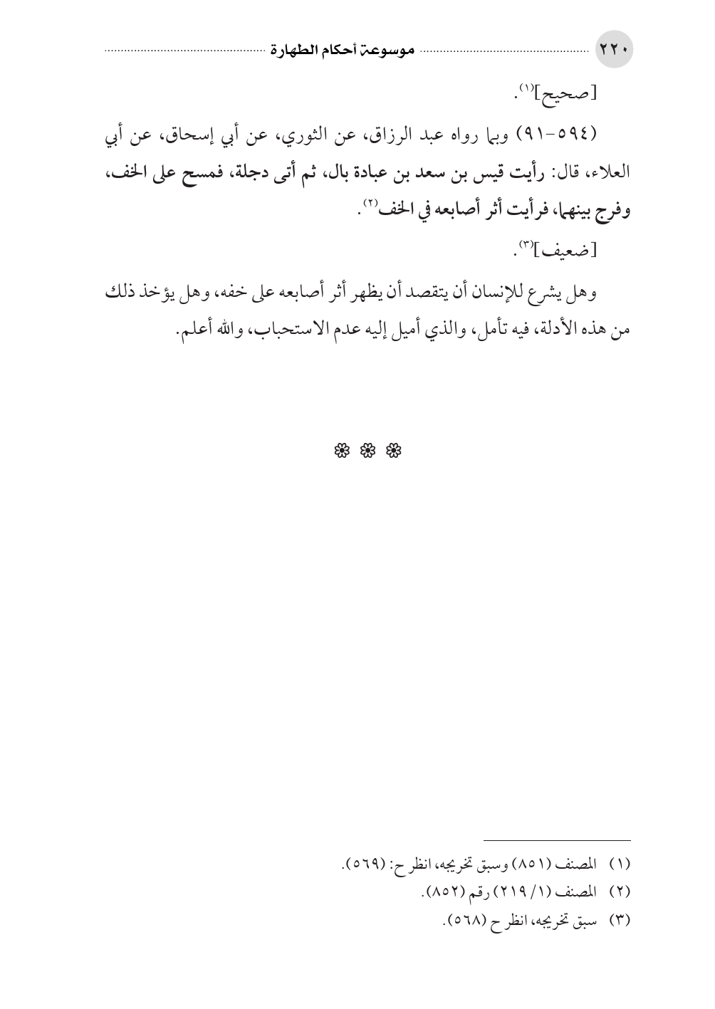 (٥٩٤ - ٩١) وبما رواه عبد الرزاق، عن الثوري، عن أبي إسحاق، عن أبي العلاء، قال: رأيت قيس بن سعد بن عبادة بال، ثم أتى دجلة، فمسح على الخف، وفرج بينهما، فرأيت أثر أصابعه في الخف (¬٢).