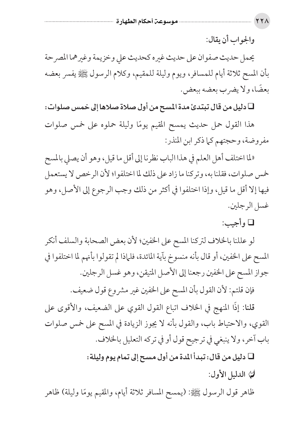 «لما اختلف أهل العلم في هذا الباب نظرنا إلى أقل ما قيل، وهو أن يصلي بالمسح خمس صلوات، فقلنا به، وتركنا ما زاد على ذلك لما اختلفوا؛ لأن الرخص لا يستعمل فيها إلا أقل ما قيل، وإذا اختلفوا في أكثر من ذلك وجب الرجوع إلى الأصل، وهو غسل الرجلين.