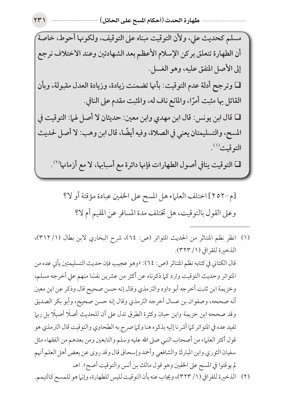 (¬٢) الذخيرة للقرافي (١/ ٣٢٣)، ويجاب عنه بأن التوقيت لليس للطهارة، وإنما هو للمسح كالتيمم.