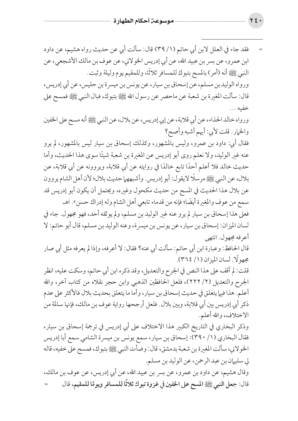 فقال أبي: داود بن عمرو، وليس بالمشهور، وكذلك إسحاق بن سيار ليس بالمشهور، لم يرو عنه غير الوليد، ولا نعلم روى أبو إدريس عن المغيرة بن شعبة شيئًا سوى هذا الحديث، وأما حديث خالد فلا أعلم أحدًا تابع خالدًا في روايته عن أبي قلابة، ويروونه عن أبي قلابة، عن بلال، عن النبي صلى الله عليه وسلم مرسلًا لايقول: أبو إدريس. وأشبههما حديث بلال؛ لأن أهل الشام يروون عن بلال هذا الحديث في المسح من حديث مكحول وغيره، ويحتمل أن يكون أبو إدريس قد سمع من عوف والمغيرة أيضًا؛ فإنه من قدماء تابعي أهل الشام وله إدراك حسن». اهـ