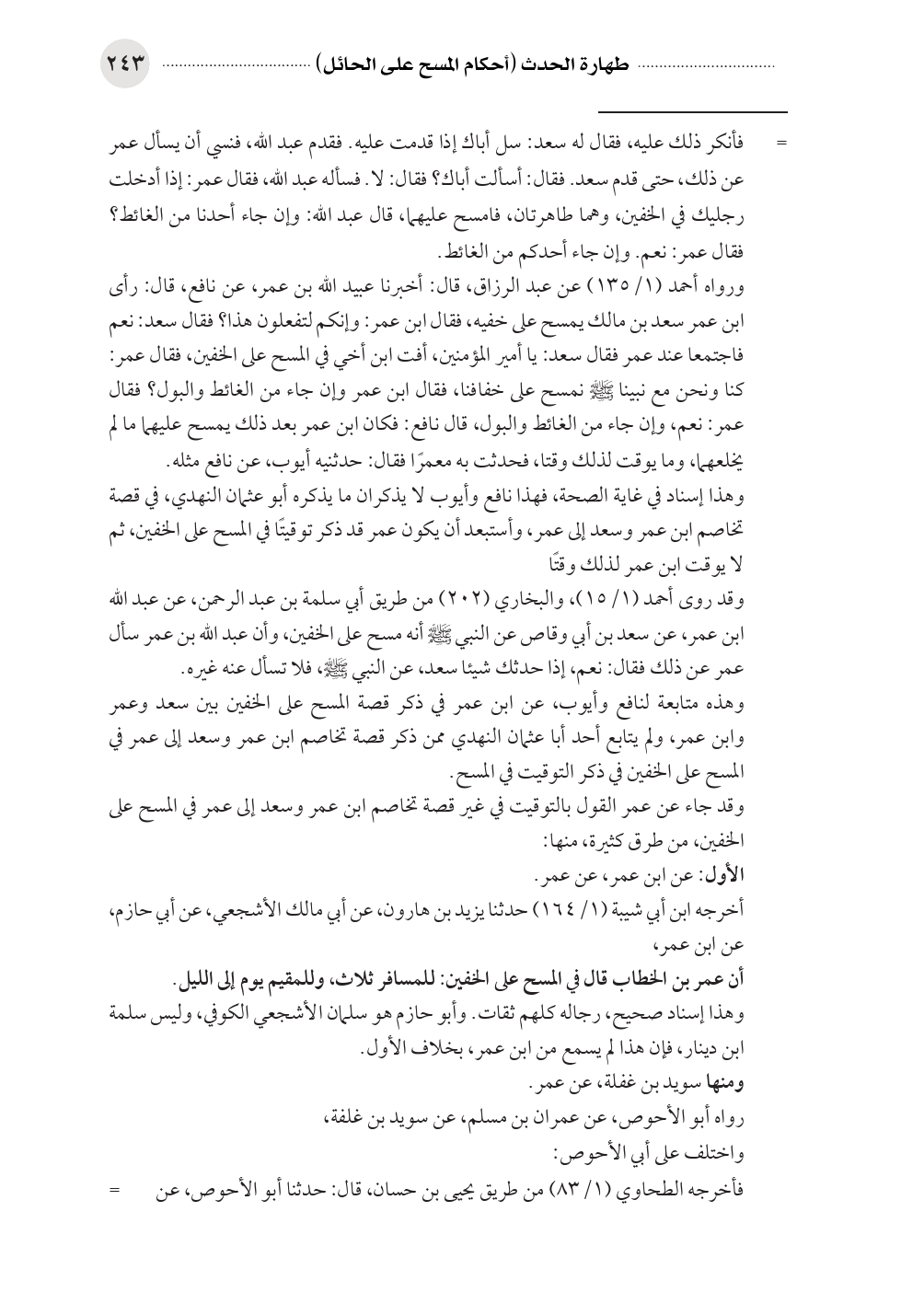 وهذا إسناد في غاية الصحة، فهذا نافع وأيوب لا يذكران ما يذكره أبو عثمان النهدي، في قصة تخاصم ابن عمر وسعد إلى عمر، وأستبعد أن يكون عمر قد ذكر توقيتًا في المسح على الخفين، ثم لا يوقت ابن عمر لذلك وقتًا، وقد روى أحمد (١/ ١٥)، والبخاري (٢٠٢) من طريق أبي سلمة بن عبد الرحمن، عن عبد الله ابن عمر، عن سعد بن أبي وقاص عن النبي صلى الله عليه وسلم أنه مسح على الخفين، وأن عبد الله بن عمر سأل عمر عن ذلك فقال: نعم، إذا حدثك شيئا سعد، عن النبي صلى الله عليه وسلم، فلا تسأل عنه غيره.