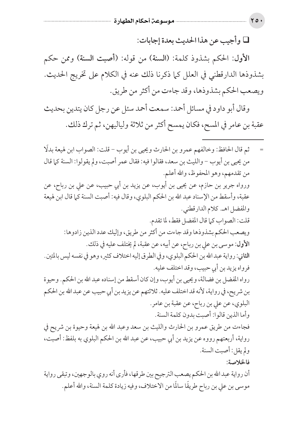 أن رواية عبد الله بن الحكم يصعب الترجيح بين طرقها، فأرى أنه روي بالوجهين، وتبقى رواية موسى بن علي بن رباح طريقًا سالمًا من الاختلاف، وفيه زيادة كلمة السنة، والله أعلم.