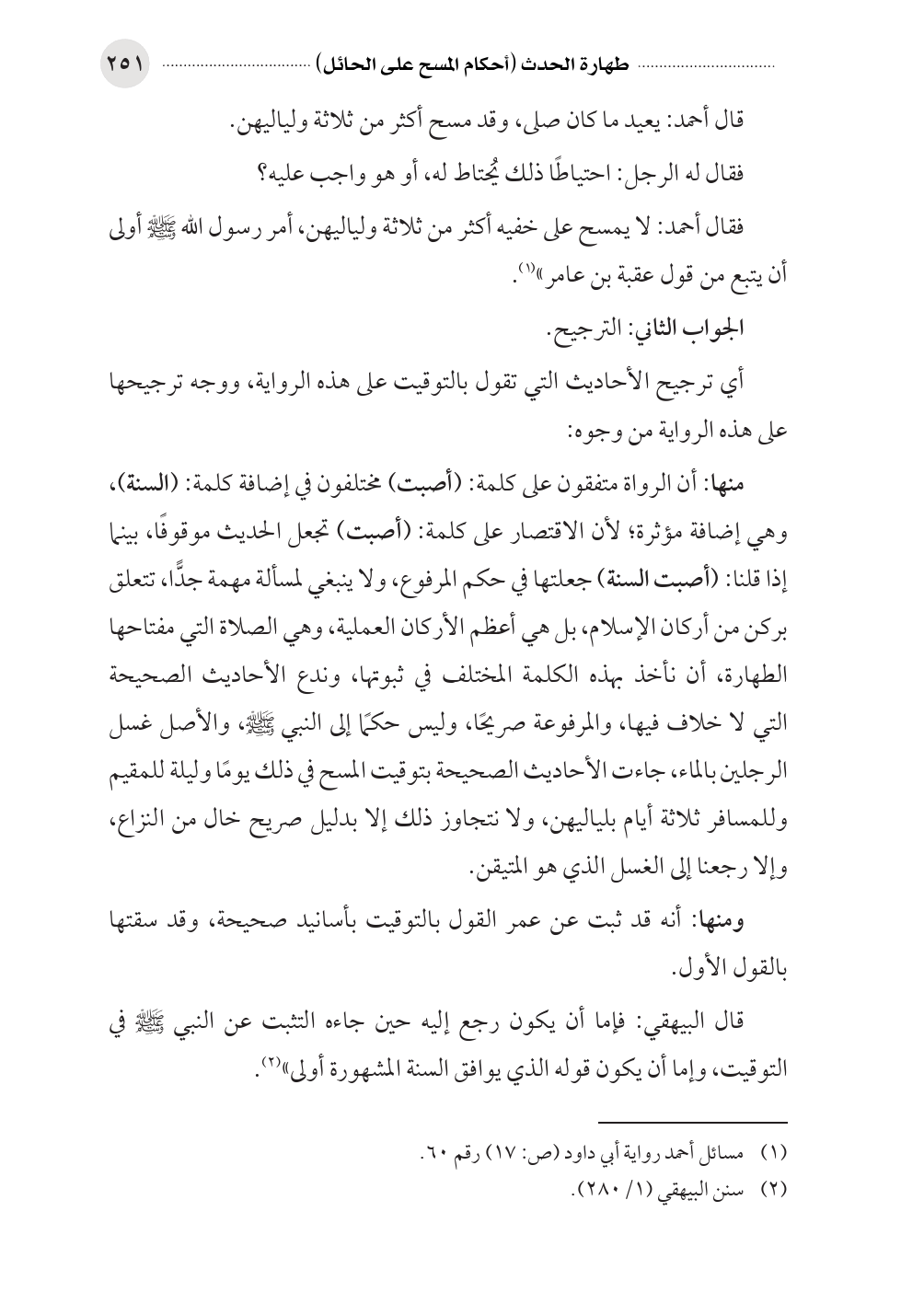 منها: أن الرواة متفقون على كلمة: (أصبت) مختلفون في إضافة كلمة: (السنة)، وهي إضافة مؤثرة؛ لأن الاقتصار على كلمة: (أصبت) تجعل الحديث موقوفًا، بينما إذا قلنا: (أصبت السنة) جعلتها في حكم المرفوع، ولا ينبغي لمسألة مهمة جدًّا، تتعلق بركن من أركان الإسلام، بل هي أعظم الأركان العملية، وهي الصلاة التي مفتاحها الطهارة، أن نأخذ بهذه الكلمة المختلف في ثبوتها، وندع الأحاديث الصحيحة التي لا خلاف فيها، والمرفوعة صريحًا، وليس حكمًا إلى النبي صلى الله عليه وسلم، والأصل غسل الرجلين بالماء، جاءت الأحاديث الصحيحة بتوقيت المسح في ذلك يومًا وليلة للمقيم وللمسافر ثلاثة أيام بلياليهن، ولا نتجاوز ذلك إلا بدليل صريح خال من النزاع، وإلا رجعنا إلى الغسل الذي هو المتيقن.