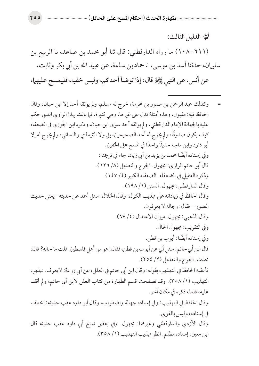 = وكذلك عبد الرحمن بن مسور بن مخرمة، خرج له مسلم، ولم يوثقه أحد إلا ابن حبان، وقال الحافظ فيه: مقبول، وهذه أمثلة تدل على غيرها، وهي كثيرة، فما بالك بهذا الراوي الذي حكم عليه بالجهالة الإمام الدارقطني، ولم يوثقه أحد سوى ابن حبان، وذكره ابن الجوزي في الضعفاء كيف يكون صدوقًا، ولم يخرج له أحد الصحيحين، بل ولا الترمذي والنسائي، ولم يخرج له إلا أبو داود وابن ماجه حديثًا واحدًا في المسح على الخفين.