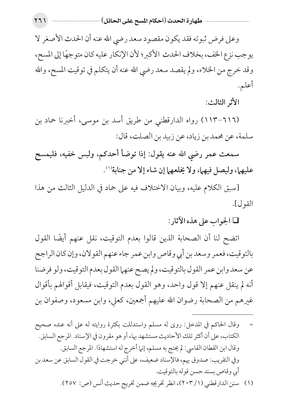 وعلى فرض ثبوته فقد يكون مقصود سعد رضي الله عنه أن الحدث الأصغر لا يوجب نزع الخف، بخلاف الحدث الأكبر؛ لأن الإنكار عليه كان متوجهًا إلى المسح، وقد خرج من الخلاء، ولم يقصد سعد رضي الله عنه أن يتكلم في توقيت المسح، والله أعلم.