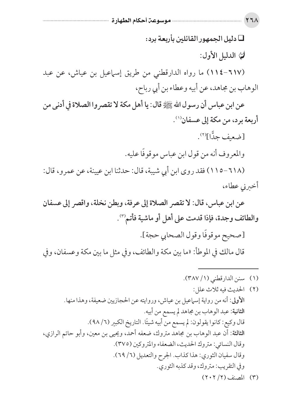 عن ابن عباس أن رسول الله صلى الله عليه وسلم قال: يا أهل مكة لا تقصروا الصلاة في أدنى من أربعة برد، من مكة إلى عسفان (¬١).