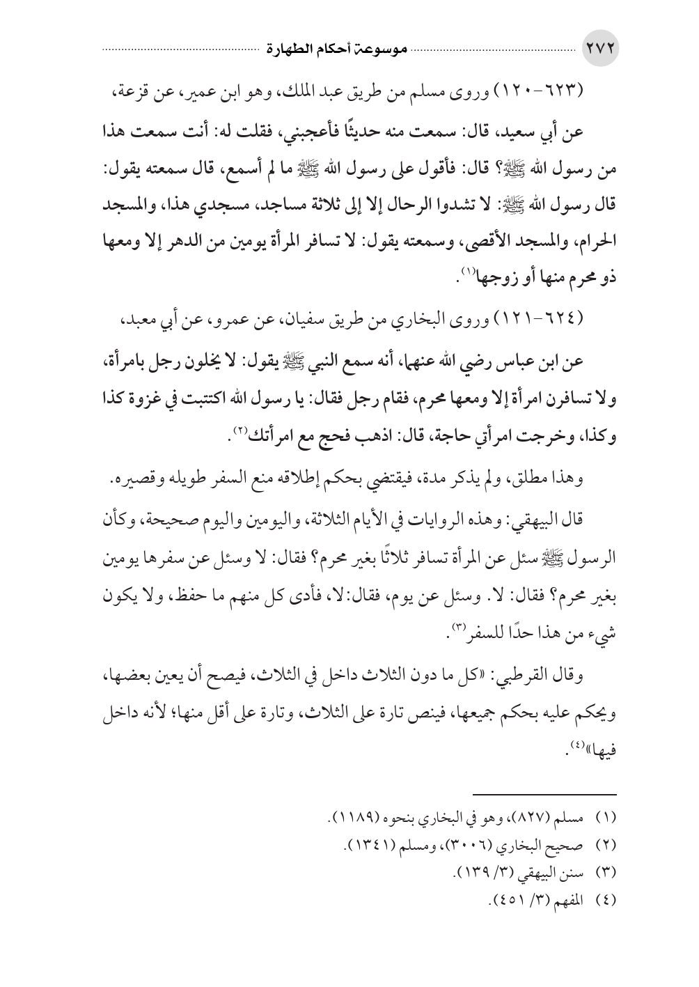 قال البيهقي: وهذه الروايات في الأيام الثلاثة، واليومين واليوم صحيحة، وكأن الرسول صلى الله عليه وسلم سئل عن المرأة تسافر ثلاثًا بغير محرم؟ فقال: لا وسئل عن سفرها يومين بغير محرم؟ فقال: لا. وسئل عن يوم، فقال: لا، فأدى كل منهم ما حفظ، ولا يكون شيء من هذا حدًا للسفر (¬٣).