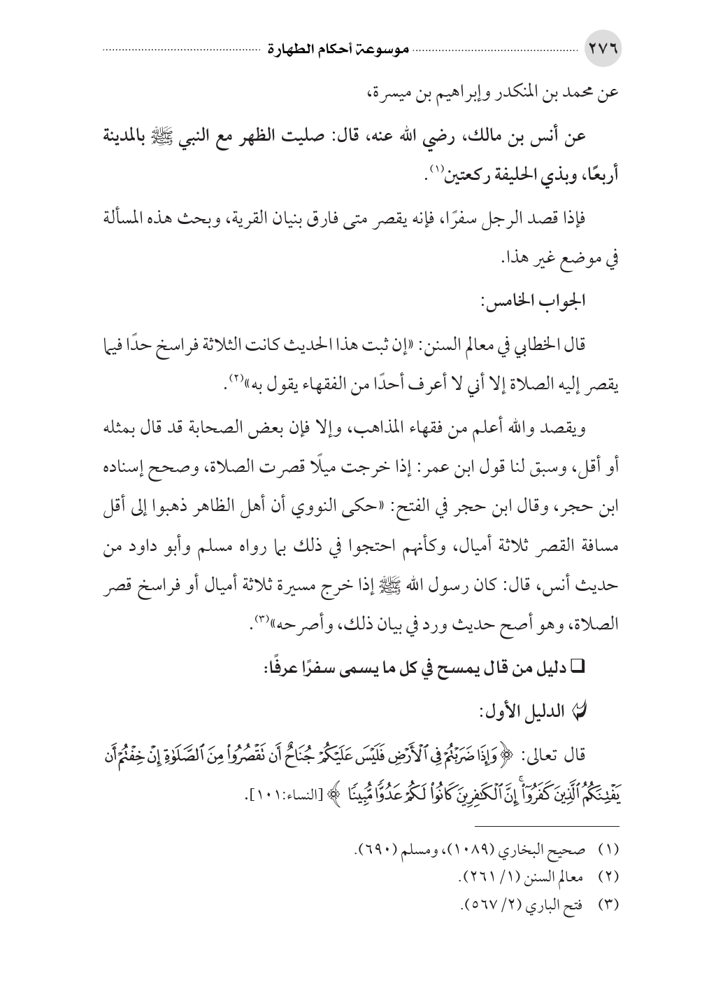 ابن حجر، وقال ابن حجر في الفتح: «حكى النووي أن أهل الظاهر ذهبوا إلى أقل مسافة القصر ثلاثة أميال، وكأنهم احتجوا في ذلك بما رواه مسلم وأبو داود من حديث أنس، قال: كان رسول الله صلى الله عليه وسلم إذا خرج مسيرة ثلاثة أميال أو فراسخ قصر الصلاة، وهو أصح حديث ورد في بيان ذلك، وأصرحه» (¬٣).