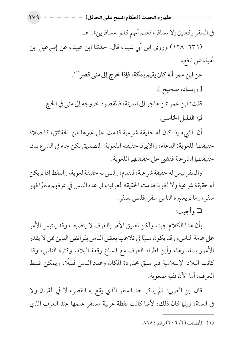 والسفر ليس له حقيقة شرعية، فتقدم، وليس له حقيقة لغوية، واللفظ إذا لم يكن له حقيقة شرعية ولا لغوية قدمت الحقيقة العرفية، فما عده الناس في عرفهم سفرًا فهو سفر، وما لم يعتبره الناس سفرًا فليس بسفر.