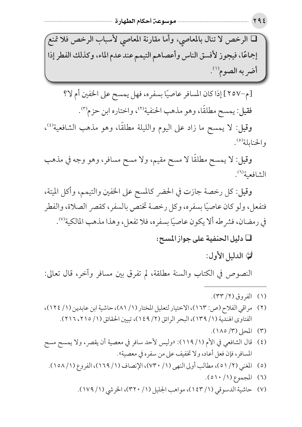 (¬٤) قال الشافعي في الأم (١/ ١١٩): «وليس لأحد سافر في معصية أن يقصر، ولا يمسح مسح المسافر، فإن فعل أعاد، ولا تخفيف على من سفره في معصية».