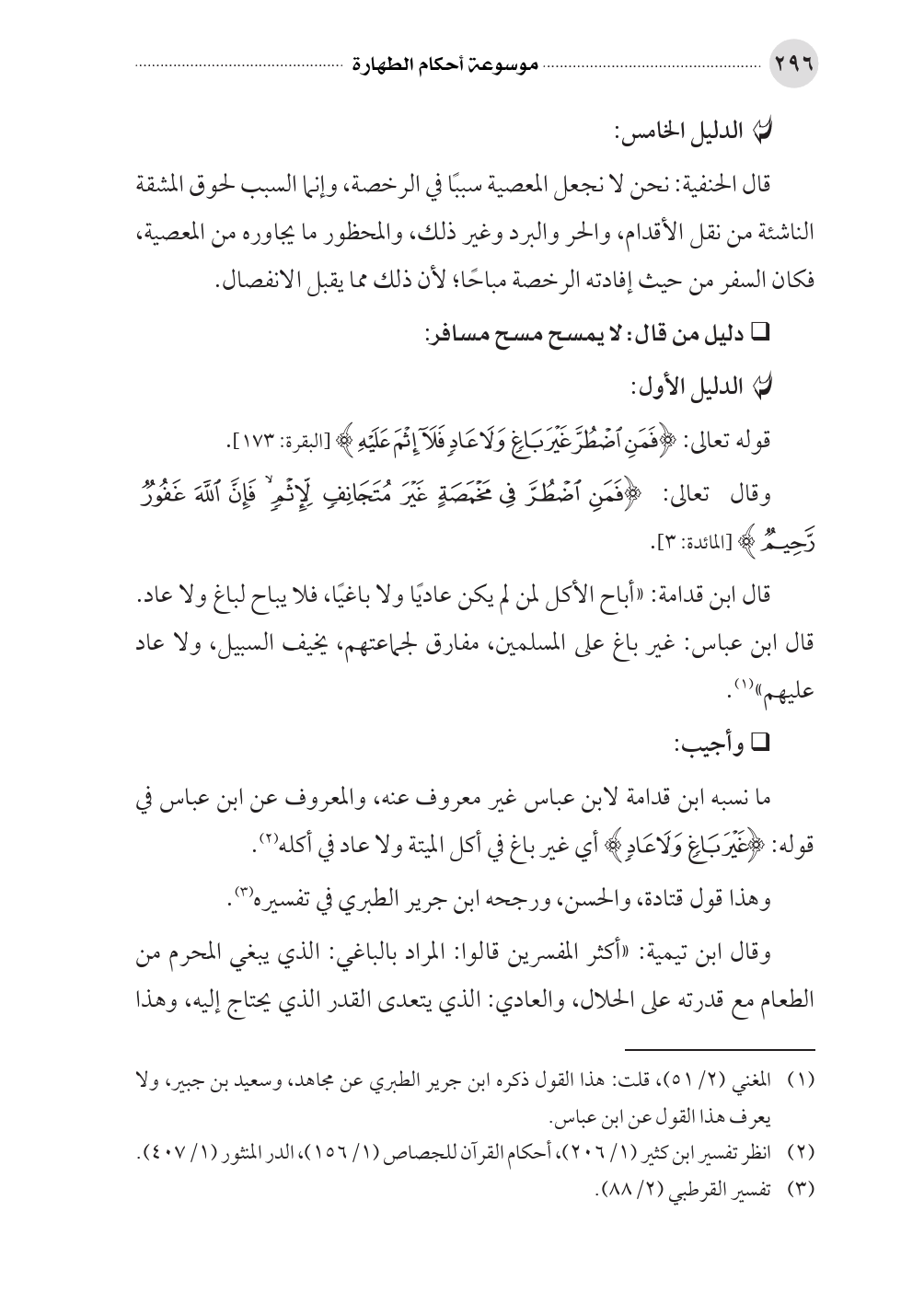 قال الحنفية: نحن لا نجعل المعصية سببًا في الرخصة، وإنما السبب لحوق المشقة الناشئة من نقل الأقدام، والحر والبرد وغير ذلك، والمحظور ما يجاوره من المعصية، فكان السفر من حيث إفادته الرخصة مباحًا؛ لأن ذلك مما يقبل الانفصال.