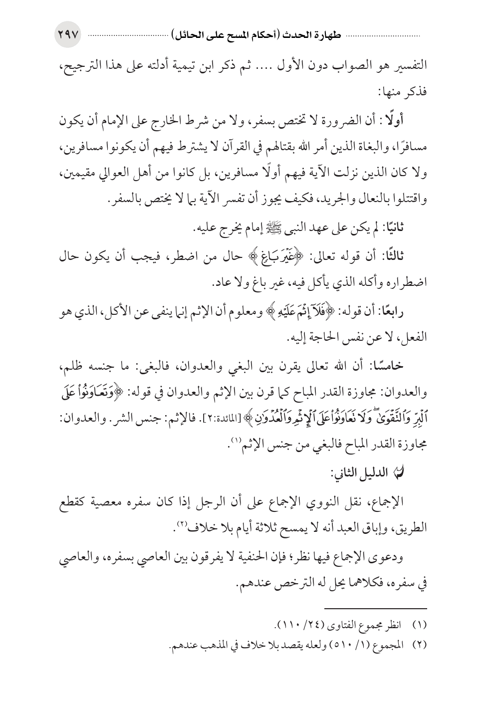 الإجماع، نقل النووي الإجماع على أن الرجل إذا كان سفره معصية كقطع الطريق، وإباق العبد أنه لا يمسح ثلاثة أيام بلا خلاف (¬٢).