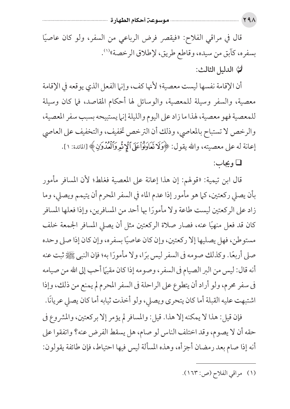 قال ابن تيمية: «قولهم: إن هذا إعانة على المعصية فغلط؛ لأن المسافر مأمور بأن يصلي ركعتين، كما هو مأمور إذا عدم الماء في السفر المحرم أن يتيمم ويصلي، وما زاد على الركعتين ليست طاعة ولا مأمورًا بها أحد من المسافرين، وإذا فعلها المسافر كان قد فعل منهيًا عنه، فصار صلاة الركعتين مثل أن يصلي المسافر الجمعة خلف مستوطن، فهل يصليها إلا ركعتين، وإن كان عاصيًا بسفره، وإن كان إذا صلى وحده صلى أربعًا. وكذلك صومه فى السفر ليس برًا، ولا مأمورًا به؛ فإن النبى صلى الله عليه وسلم ثبت عنه أنه قال: ليس من البر الصيام فى السفر، وصومه إذا كان مقيمًا أحب إلى الله من صيامه فى سفر محرم، ولو أراد أن يتطوع على الراحلة فى السفر المحرم لم يمنع من ذلك، وإذا اشتبهت عليه القبلة أما كان يتحرى ويصلي، ولو أخذت ثيابه أما كان يصلي عريانًا.