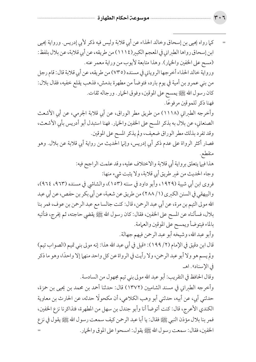 ورواية خالد الحذاء أخرجها الروياني في مسنده (٧٣٥) من طريقه، عن أبي قلابة قال: قام رجل من بني عمرو بن أمية في يوم بارد، فتوضأ من مطهرة بدمش، فذهب يقلع خفيه، فقال بلال: كان رسول الله صلى الله عليه وسلم يمسح على الموقين، وفوق الخمار. ورجاله ثقات.