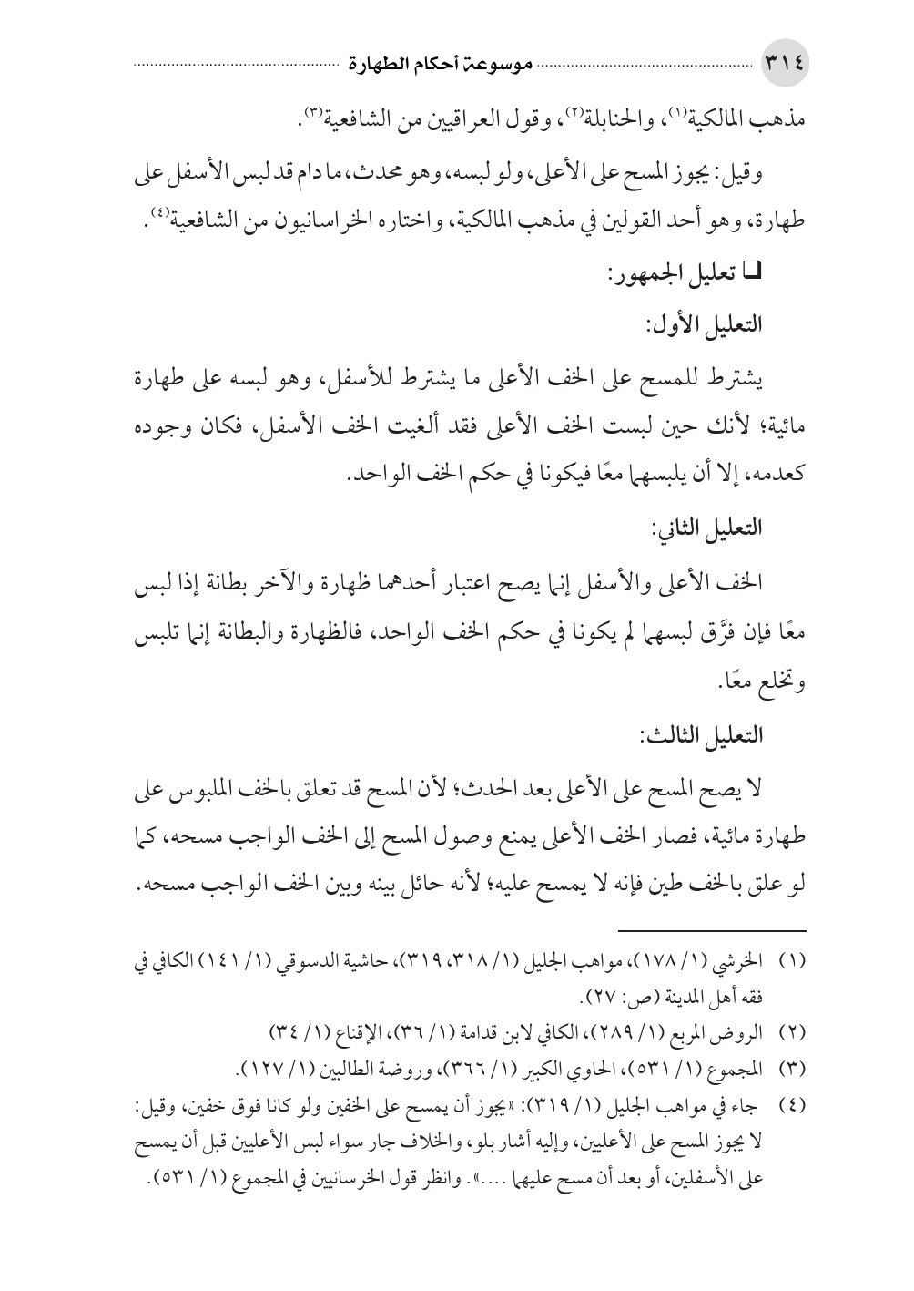 (¬٤) جاء في مواهب الجليل (١/ ٣١٩): «يجوز أن يمسح على الخفين ولو كانا فوق خفين، وقيل: لا يجوز المسح على الأعليين، وإليه أشار بلو، والخلاف جار سواء لبس الأعليين قبل أن يمسح على الأسفلين، أو بعد أن مسح عليهما .... ». وانظر قول الخرسانيين في المجموع (١/ ٥٣١).