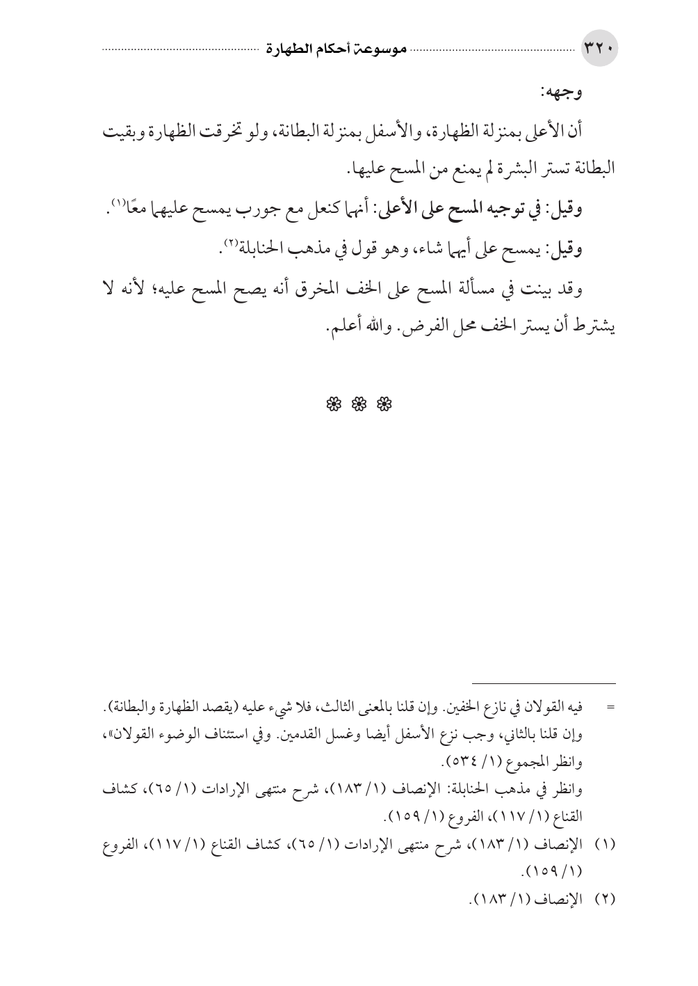وقيل: في توجيه المسح على الأعلى: أنهما كنعل مع جورب يمسح عليهما معًا (¬١).