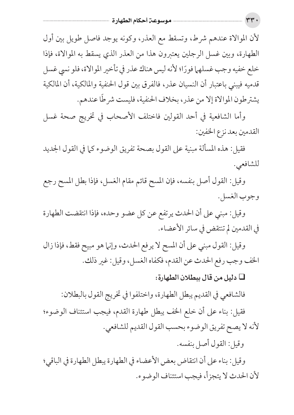 وقيل: مبني على أن الحدث يرتفع عن كل عضو وحده، فإذا انتقضت الطهارة في القدمين لم تنتقض في سائر الأعضاء.