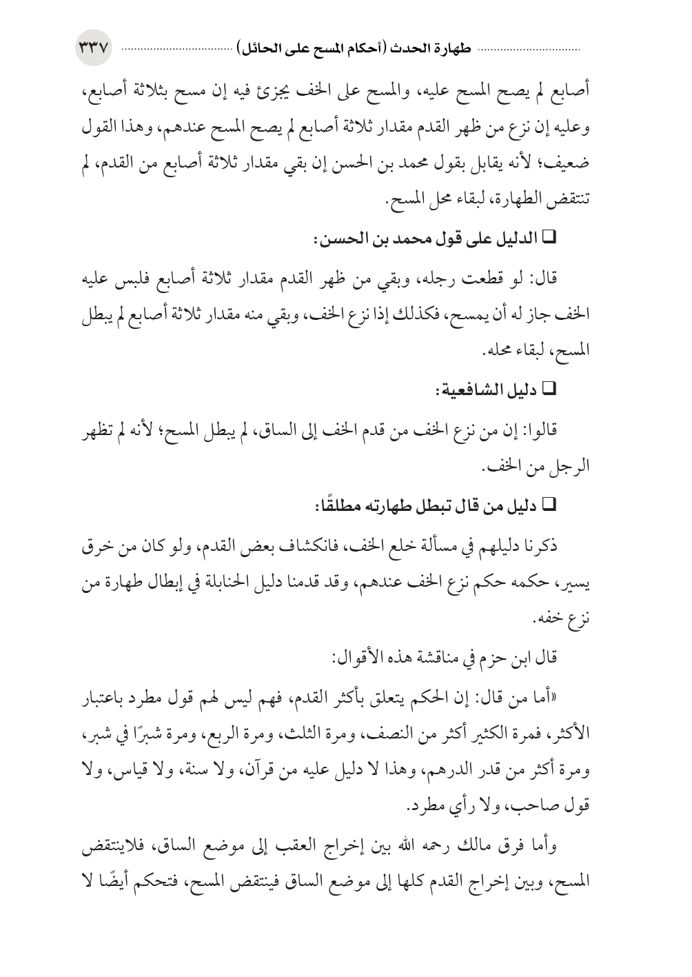 أصابع لم يصح المسح عليه، والمسح على الخف يجزئ فيه إن مسح بثلاثة أصابع، وعليه إن نزع من ظهر القدم مقدار ثلاثة أصابع لم يصح المسح عندهم، وهذا القول ضعيف؛ لأنه يقابل بقول محمد بن الحسن إن بقي مقدار ثلاثة أصابع من القدم، لم تنتقض الطهارة، لبقاء محل المسح.