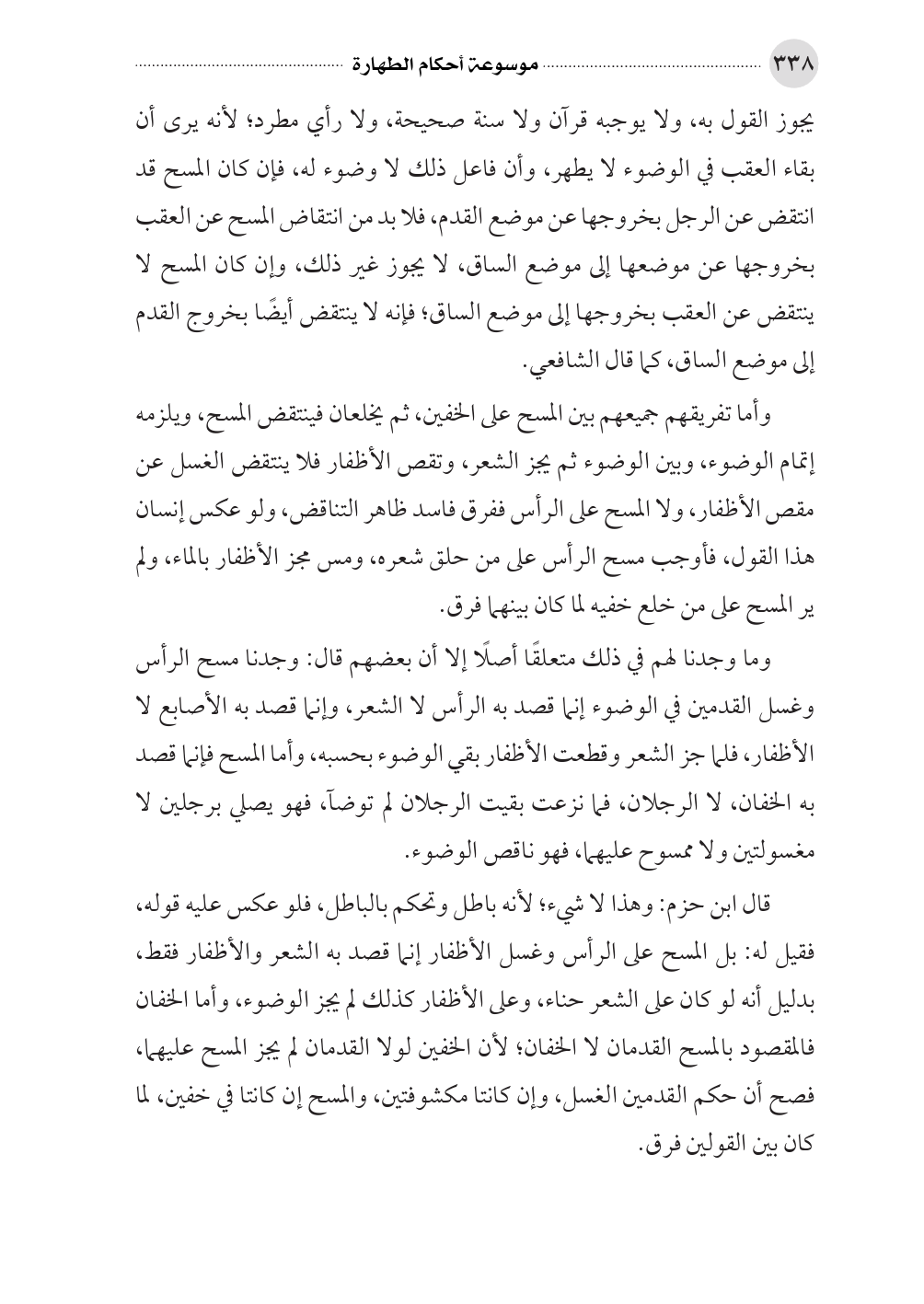 يجوز القول به، ولا يوجبه قرآن ولا سنة صحيحة، ولا رأي مطرد؛ لأنه يرى أن بقاء العقب في الوضوء لا يطهر، وأن فاعل ذلك لا وضوء له، فإن كان المسح قد انتقض عن الرجل بخروجها عن موضع القدم، فلا بد من انتقاض المسح عن العقب بخروجها عن موضعها إلى موضع الساق، لا يجوز غير ذلك، وإن كان المسح لا ينتقض عن العقب بخروجها إلى موضع الساق؛ فإنه لا ينتقض أيضًا بخروج القدم إلى موضع الساق، كما قال الشافعي.