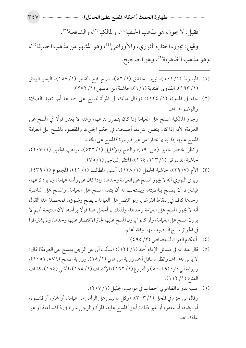 (¬٣) الأم (٧/ ٢٩)، حاشية الجمل (١/ ١٢٨)، أسنى المطالب (١/ ٤١)، المجموع (١/ ٤٣٩). ويرى النووي أنه لا يجوز المسح على العمامة وحدها، وإذا كان على رأسه عمامة، ولم يرد نزعها، فيشترط أن يمسح بناصيته، ويستحب له أن يتمم المسح على العمامة. والمسح على الناصية وحدها كاف في إسقاط الفرض، ولو اقتصر على العمامة لم يصح وضوؤه. فمحصلة هذا القول أنه لا يجوز المسح على العمامة وحدها، ولذلك لم أجعل هذا قولًا برأسه، لأن النتيجة أنهم لا يرون المسح على العمامة، ولو كانوا يرون المسح عليها لجاز الاقتصار عليها وحدها، ولم يشترطوا في الجواز مسح الناصية معها. والله أعلم.