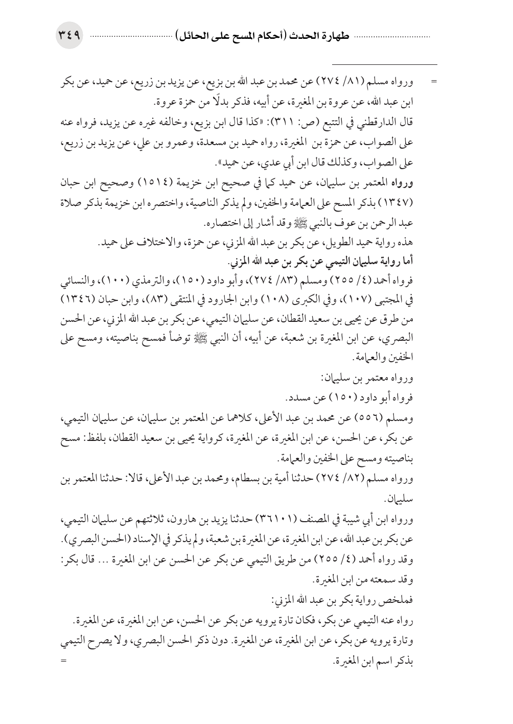 ومسلم (٥٥٦) عن محمد بن عبد الأعلى، كلاهما عن المعتمر بن سليمان، عن سليمان التيمي، عن بكر، عن الحسن، عن ابن المغيرة، عن المغيرة، كرواية يحيى بن سعيد القطان، بلفظ: مسح بناصيته ومسح على الخفين والعمامة.