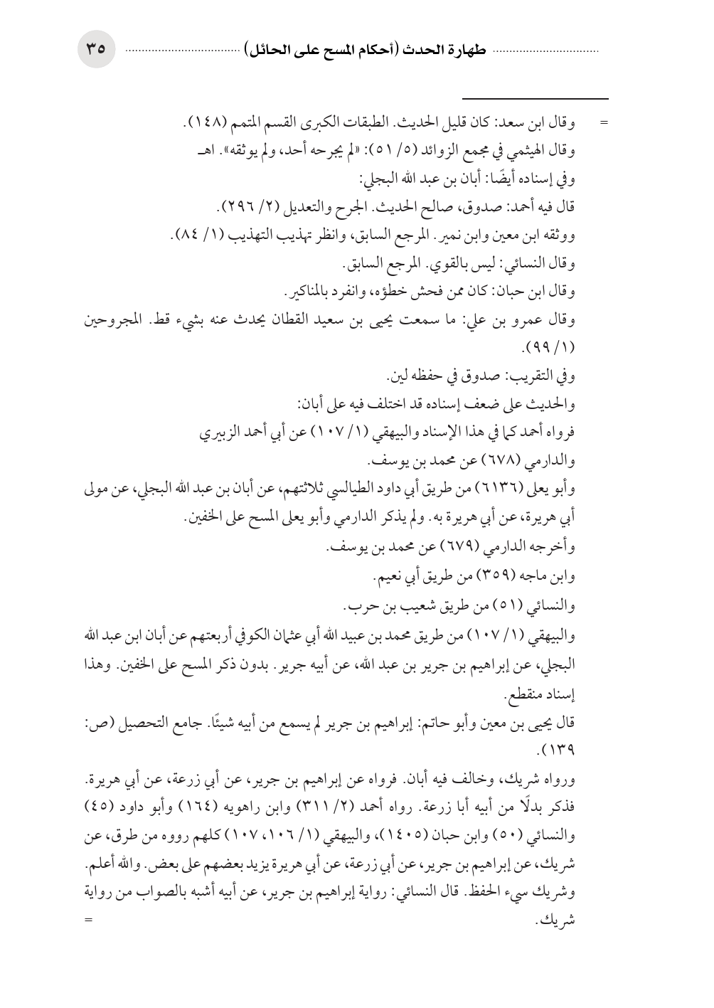 والبيهقي (١/ ١٠٧) من طريق محمد بن عبيد الله أبي عثمان الكوفي أربعتهم عن أبان ابن عبد الله البجلي، عن إبراهيم بن جرير بن عبد الله، عن أبيه جرير. بدون ذكر المسح على الخفين. وهذا إسناد منقطع.