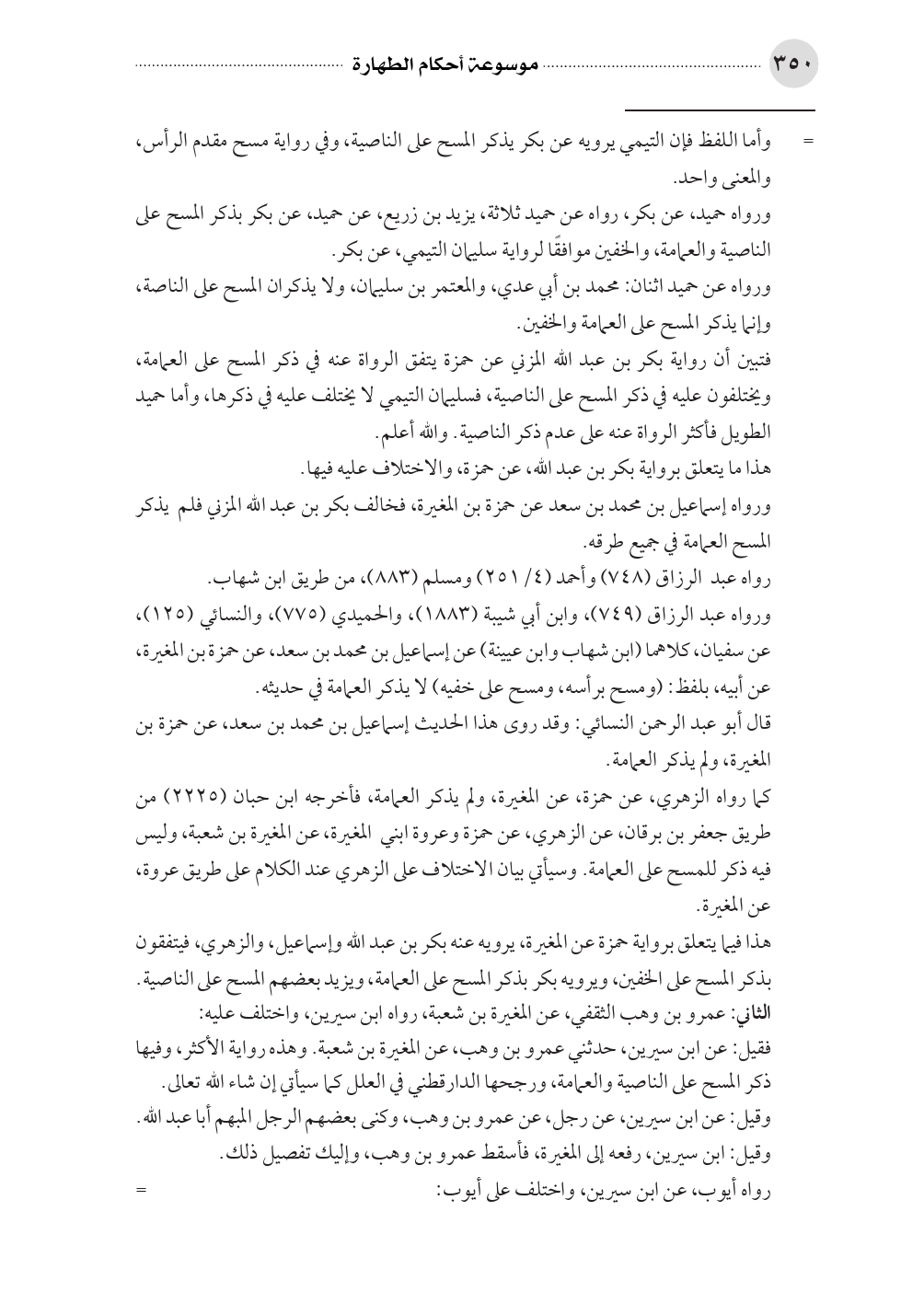 فتبين أن رواية بكر بن عبد الله المزني عن حمزة يتفق الرواة عنه في ذكر المسح على العمامة، ويختلفون عليه في ذكر المسح على الناصية، فسليمان التيمي لا يختلف عليه في ذكرها، وأما حميد الطويل فأكثر الرواة عنه على عدم ذكر الناصية. والله أعلم.