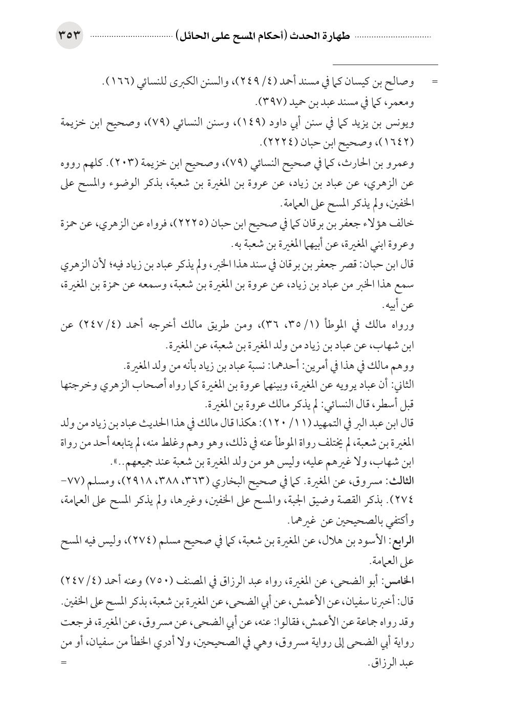 وعمرو بن الحارث، كما في صحيح النسائي (٧٩)، وصحيح ابن خزيمة (٢٠٣). كلهم رووه عن الزهري، عن عباد بن زياد، عن عروة بن المغيرة بن شعبة، بذكر الوضوء والمسح على الخفين، ولم يذكر المسح على العمامة.