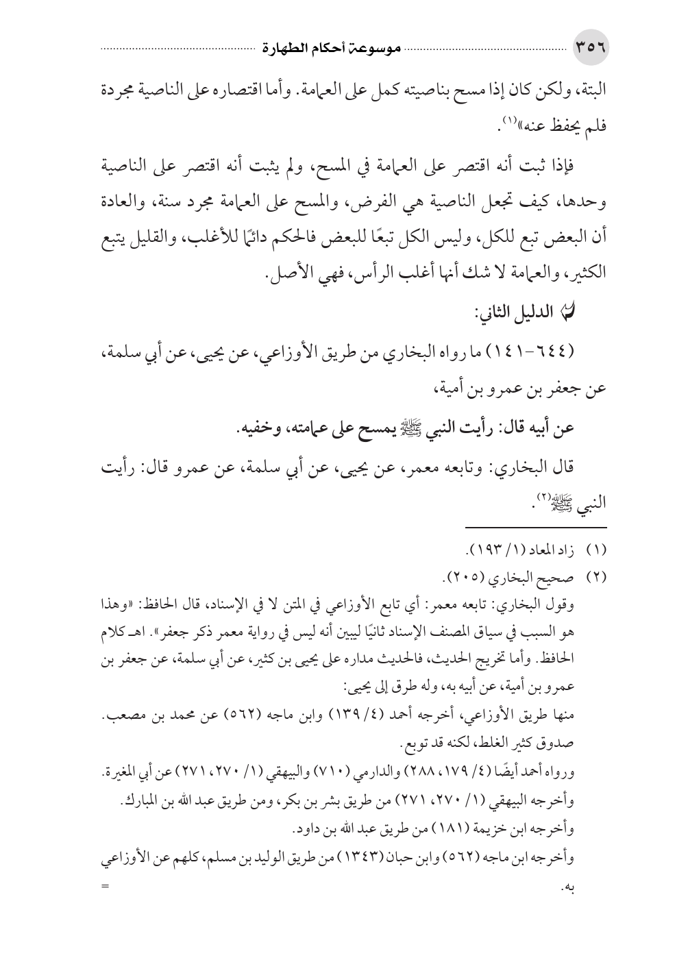 فإذا ثبت أنه اقتصر على العمامة في المسح، ولم يثبت أنه اقتصر على الناصية وحدها، كيف تجعل الناصية هي الفرض، والمسح على العمامة مجرد سنة، والعادة أن البعض تبع للكل، وليس الكل تبعًا للبعض فالحكم دائمًا للأغلب، والقليل يتبع الكثير، والعمامة لا شك أنها أغلب الرأس، فهي الأصل.
