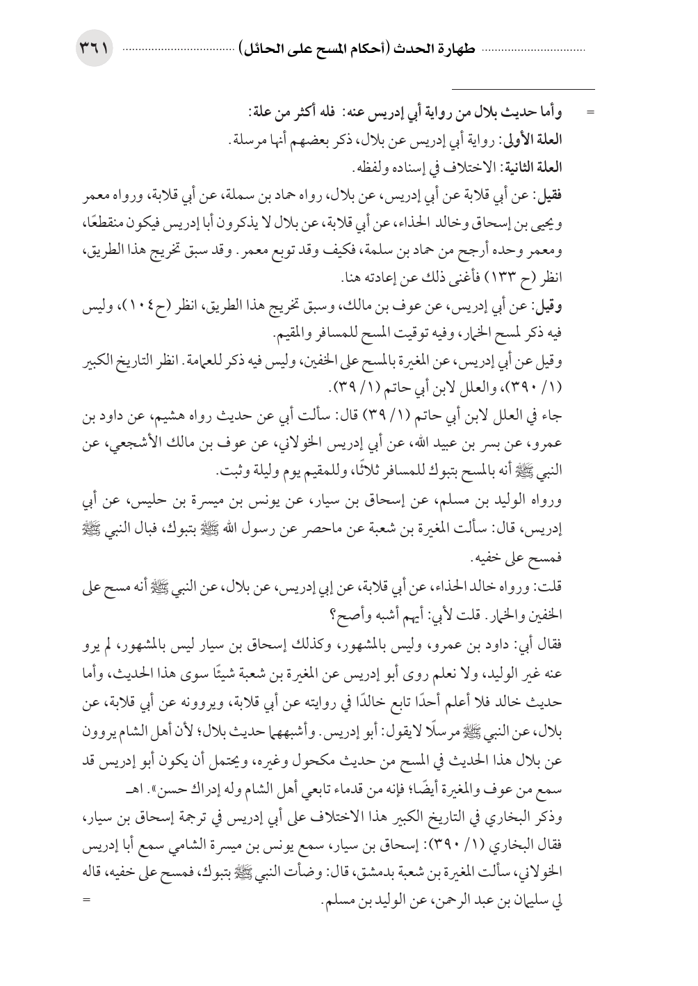 فقال أبي: داود بن عمرو، وليس بالمشهور، وكذلك إسحاق بن سيار ليس بالمشهور، لم يرو عنه غير الوليد، ولا نعلم روى أبو إدريس عن المغيرة بن شعبة شيئًا سوى هذا الحديث، وأما حديث خالد فلا أعلم أحدًا تابع خالدًا في روايته عن أبي قلابة، ويروونه عن أبي قلابة، عن بلال، عن النبي صلى الله عليه وسلم مرسلًا لايقول: أبو إدريس. وأشبههما حديث بلال؛ لأن أهل الشام يروون عن بلال هذا الحديث في المسح من حديث مكحول وغيره، ويحتمل أن يكون أبو إدريس قد سمع من عوف والمغيرة أيضًا؛ فإنه من قدماء تابعي أهل الشام وله إدراك حسن». اهـ