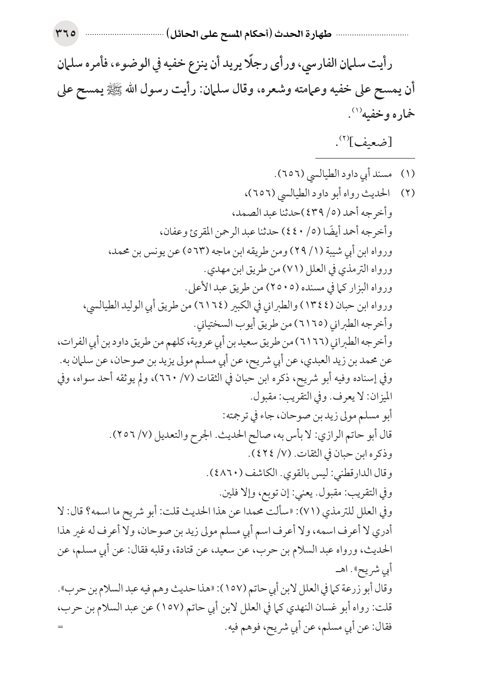 وفي العلل للترمذي (٧١): «سألت محمدا عن هذا الحديث قلت: أبو شريح ما اسمه؟ قال: لا أدري لا أعرف اسمه، ولا أعرف اسم أبي مسلم مولى زيد بن صوحان، ولا أعرف له غير هذا الحديث، ورواه عبد السلام بن حرب، عن سعيد، عن قتادة، وقلبه فقال: عن أبي مسلم، عن أبي شريح». اهـ